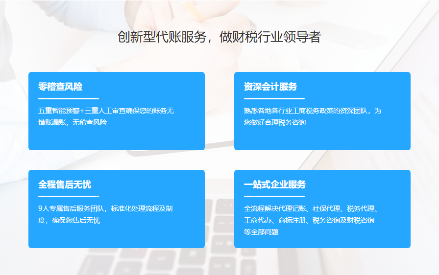 包含每月做账、财务核算、税务申报、出具报表等,精心推荐行业资深会计提供价廉质优的全流程代账服务。(如客户有特殊需求,专属财税专家可提供上门服务)